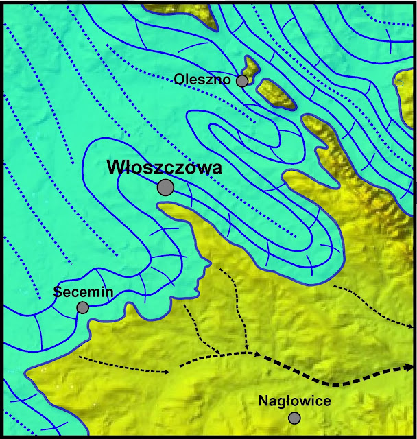 Obecnie zlodowacenie Odry (ze stadiałem recesyjnym Warty) łączone jest z MIS 6 [por. 11]. W rejonie Włoszczowy obserwuje się granicę jego zasięgu [por. 7, 8, 12, 13, 14, 15, 16, 17, 18], rekonstrukcję której przedstawia poniższy rysunek. Widać dużą zależność rozmieszczenia czoła lądolodu wynikającą ze zróżnicowanej rzeźby (zwłaszcza wpływ Pasma Przedborsko-Małogoskiego). Pobyt lądolodu Odry miał miejsce tutaj około 150-140 ka BP. Lód w obrębie jęzorów wnikających w istniejące obniżenia mógł mieć miąższość kilkudziesięciu metrów, może dochodził do 100 m.